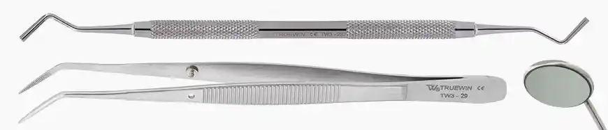 Ротовые зеркала используются для осмотра состояния зубов и полости рта, а также для оттягивания языка Зонды — существует множество зондов, но основными типами являются прямой зонд, зонд Брио и Прямой зонд острый, и он используется для осмотра полостей в области дентина, а также для проверки. Зонд Брио также острый, и он используется для обнаружения соединений между эмалью и дентином. Зонд Брио также может использоваться для обнаружения зубного камня, скрытого в десне.